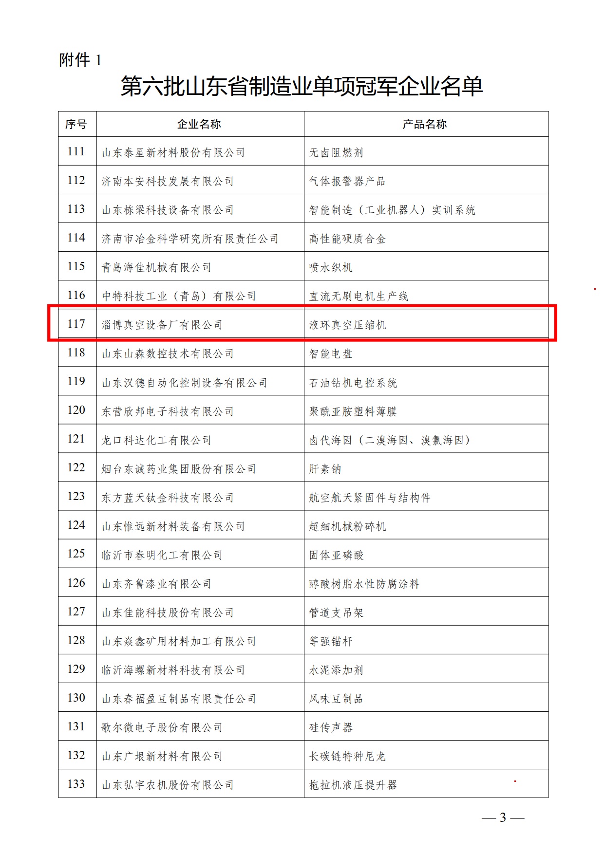 8月18日,山東省工業(yè)和信息化廳、山東省工業(yè)經(jīng)濟聯(lián)合會聯(lián)合發(fā)布《關于公布第六批山東省制造業(yè)單項冠軍企業(yè)、單項冠軍產(chǎn)品和通過復核的第三批制造業(yè)單項冠軍企業(yè)名單的通知》,公司憑借液環(huán)真空泵及壓縮機較高的市場占有率和細分行業(yè)領域領軍地位,榜上有名。這是繼公司2020年搬遷以來榮獲山東省專精特新中小企業(yè)、山東省瞪羚企業(yè)、山東省軍民融合企業(yè)和淄博市綠色工廠以后又一項殊榮!