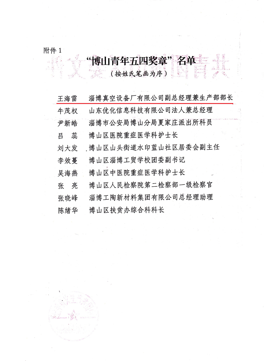 摘要:公司副總經(jīng)理王海雷同志榮獲“博山區(qū)青年五四獎章”稱號