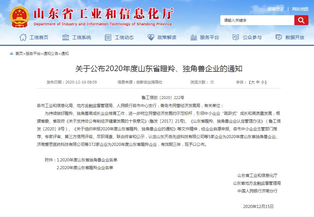 12月15日,根據(jù)《關(guān)于公布2020年度山東省瞪羚、獨角獸企業(yè)的通知》魯工信創(chuàng)[2020]222號文,省工業(yè)和信息化廳確定5家企業(yè)為2020年度山東省獨角獸企業(yè)、372家企業(yè)為2020年度山東省瞪羚企業(yè)。雙山真空作為山東省真空設(shè)備龍頭企業(yè),以領(lǐng)先的科技研發(fā)和穩(wěn)定增長的市場占有率入選為2020年度山東省瞪羚企業(yè)!