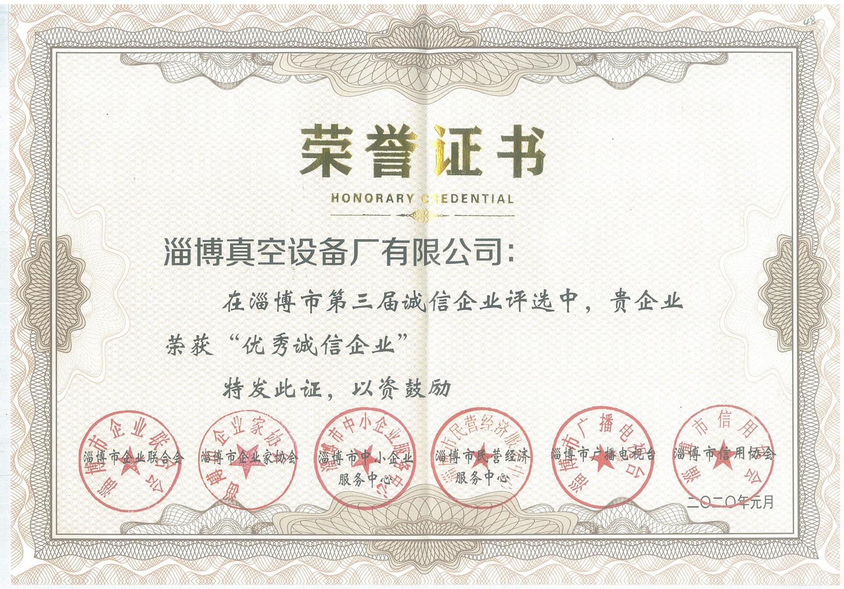 2020年1月9日,淄博市第三屆誠信企業(yè)授牌儀式在山東齊盛國際賓館會議中心隆重舉行。在本次評選授獎活動中,淄博真空設備廠有限公司再次被評為“淄博市優(yōu)秀誠信企業(yè)”。